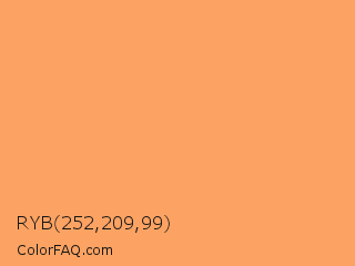 RYB 252,209,99 Color is a light orange color and the nearest color is Sandy Brown #f4a460. Hex code #fca363 and RGB value is rgb(252,163,99). In RGB color space, this color is composed of 99% red, 64% green, 39% blue, In CMYK color space, this color is composed of 0% cyan, 35% magenta, 61% yellow , 1% black , In HSL color space, this color has a hue angle of 25° , 96% saturation and 69% lightness.