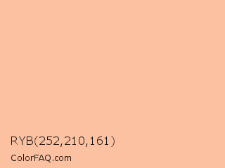 RYB 252,210,161 Color is a very light orange color and the nearest color is Wax Flower #ffc0a8. Hex code #fcc1a1 and RGB value is rgb(252,193,161). In RGB color space, this color is composed of 99% red, 76% green, 63% blue, In CMYK color space, this color is composed of 0% cyan, 23% magenta, 36% yellow , 1% black , In HSL color space, this color has a hue angle of 21° , 94% saturation and 81% lightness.