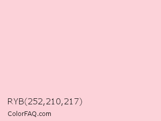 RYB 252,210,217 Color is a very light red color and the nearest color is Pastel Pink #ffd1dc. Hex code #fcd2d9 and RGB value is rgb(252,210,217). In RGB color space, this color is composed of 99% red, 82% green, 85% blue, In CMYK color space, this color is composed of 0% cyan, 17% magenta, 14% yellow , 1% black , In HSL color space, this color has a hue angle of 350° , 88% saturation and 91% lightness.