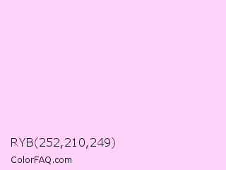 RYB 252,210,249 Color is a very light magenta color and the nearest color is Shampoo #ffcff1. Hex code #fcd2f9 and RGB value is rgb(252,210,249). In RGB color space, this color is composed of 99% red, 82% green, 98% blue, In CMYK color space, this color is composed of 0% cyan, 17% magenta, 1% yellow , 1% black , In HSL color space, this color has a hue angle of 304° , 88% saturation and 91% lightness.