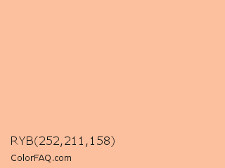 RYB 252,211,158 Color is a light orange color and the nearest color is Wax Flower #ffc0a8. Hex code #fcc09e and RGB value is rgb(252,192,158). In RGB color space, this color is composed of 99% red, 75% green, 62% blue, In CMYK color space, this color is composed of 0% cyan, 24% magenta, 37% yellow , 1% black , In HSL color space, this color has a hue angle of 22° , 94% saturation and 80% lightness.
