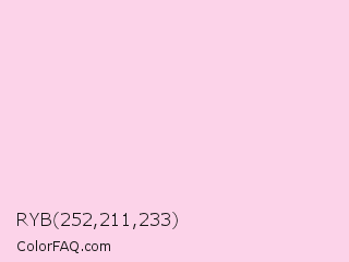 RYB 252,211,233 Color is a very light rose color and the nearest color is Pig Pink #fdd7e4. Hex code #fcd3e9 and RGB value is rgb(252,211,233). In RGB color space, this color is composed of 99% red, 83% green, 91% blue, In CMYK color space, this color is composed of 0% cyan, 16% magenta, 8% yellow , 1% black , In HSL color space, this color has a hue angle of 328° , 87% saturation and 91% lightness.