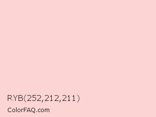 RYB 252,212,211 Color is a very light red color and the nearest color is Cosmos #ffd8d9. Hex code #fcd4d3 and RGB value is rgb(252,212,211). In RGB color space, this color is composed of 99% red, 83% green, 83% blue, In CMYK color space, this color is composed of 0% cyan, 16% magenta, 16% yellow , 1% black , In HSL color space, this color has a hue angle of 1° , 87% saturation and 91% lightness.