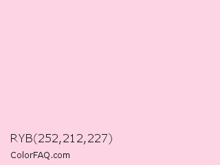 RYB 252,212,227 Color is a very light rose color and the nearest color is Pig Pink #fdd7e4. Hex code #fcd4e3 and RGB value is rgb(252,212,227). In RGB color space, this color is composed of 99% red, 83% green, 89% blue, In CMYK color space, this color is composed of 0% cyan, 16% magenta, 10% yellow , 1% black , In HSL color space, this color has a hue angle of 338° , 87% saturation and 91% lightness.