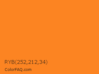 RYB 252,212,34 Color is a normal orange color and the nearest color is Princeton Orange #f58025. Hex code #fc8422 and RGB value is rgb(252,132,34). In RGB color space, this color is composed of 99% red, 52% green, 13% blue, In CMYK color space, this color is composed of 0% cyan, 48% magenta, 87% yellow , 1% black , In HSL color space, this color has a hue angle of 27° , 97% saturation and 56% lightness.