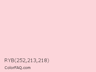 RYB 252,213,218 Color is a very light red color and the nearest color is Cosmos #ffd8d9. Hex code #fcd5da and RGB value is rgb(252,213,218). In RGB color space, this color is composed of 99% red, 84% green, 85% blue, In CMYK color space, this color is composed of 0% cyan, 15% magenta, 13% yellow , 1% black , In HSL color space, this color has a hue angle of 352° , 87% saturation and 91% lightness.