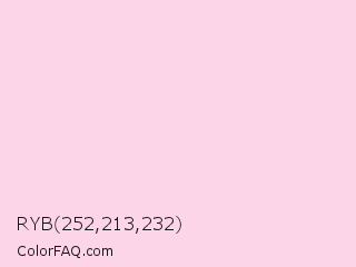 RYB 252,213,232 Color is a very light rose color and the nearest color is Pig Pink #fdd7e4. Hex code #fcd5e8 and RGB value is rgb(252,213,232). In RGB color space, this color is composed of 99% red, 84% green, 91% blue, In CMYK color space, this color is composed of 0% cyan, 15% magenta, 8% yellow , 1% black , In HSL color space, this color has a hue angle of 331° , 87% saturation and 91% lightness.