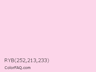 RYB 252,213,233 Color is a very light rose color and the nearest color is Pig Pink #fdd7e4. Hex code #fcd5e9 and RGB value is rgb(252,213,233). In RGB color space, this color is composed of 99% red, 84% green, 91% blue, In CMYK color space, this color is composed of 0% cyan, 15% magenta, 8% yellow , 1% black , In HSL color space, this color has a hue angle of 329° , 87% saturation and 91% lightness.