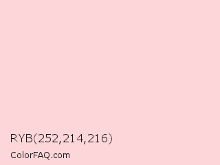 RYB 252,214,216 Color is a very light red color and the nearest color is Cosmos #ffd8d9. Hex code #fcd6d8 and RGB value is rgb(252,214,216). In RGB color space, this color is composed of 99% red, 84% green, 85% blue, In CMYK color space, this color is composed of 0% cyan, 15% magenta, 14% yellow , 1% black , In HSL color space, this color has a hue angle of 357° , 86% saturation and 91% lightness.