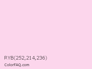 RYB 252,214,236 Color is a very light magenta color and the nearest color is Cherub #f8d9e9. Hex code #fcd6ec and RGB value is rgb(252,214,236). In RGB color space, this color is composed of 99% red, 84% green, 93% blue, In CMYK color space, this color is composed of 0% cyan, 15% magenta, 6% yellow , 1% black , In HSL color space, this color has a hue angle of 325° , 86% saturation and 91% lightness.