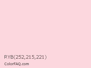 RYB 252,215,221 Color is a very light red color and the nearest color is Pale Pink #fadadd. Hex code #fcd7dd and RGB value is rgb(252,215,221). In RGB color space, this color is composed of 99% red, 84% green, 87% blue, In CMYK color space, this color is composed of 0% cyan, 15% magenta, 12% yellow , 1% black , In HSL color space, this color has a hue angle of 350° , 86% saturation and 92% lightness.