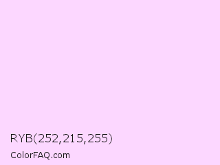 RYB 252,215,255 Color is a very light magenta color and the nearest color is Pink Lace #ffddf4. Hex code #fcd7ff and RGB value is rgb(252,215,255). In RGB color space, this color is composed of 99% red, 84% green, 100% blue, In CMYK color space, this color is composed of 1% cyan, 16% magenta, 0% yellow , 0% black , In HSL color space, this color has a hue angle of 296° , 100% saturation and 92% lightness.