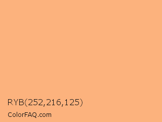 RYB 252,216,125 Color is a light orange color and the nearest color is Very Light Tangelo #ffb077. Hex code #fcb27d and RGB value is rgb(252,178,125). In RGB color space, this color is composed of 99% red, 70% green, 49% blue, In CMYK color space, this color is composed of 0% cyan, 29% magenta, 50% yellow , 1% black , In HSL color space, this color has a hue angle of 25° , 95% saturation and 74% lightness.