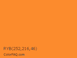 RYB 252,216,46 Color is a normal orange color and the nearest color is Neon Carrot Crayola #ff9933. Hex code #fc8b2e and RGB value is rgb(252,139,46). In RGB color space, this color is composed of 99% red, 55% green, 18% blue, In CMYK color space, this color is composed of 0% cyan, 45% magenta, 82% yellow , 1% black , In HSL color space, this color has a hue angle of 27° , 97% saturation and 58% lightness.