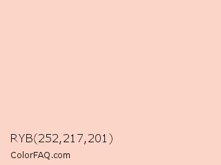 RYB 252,217,201 Color is a very light red color and the nearest color is Unbleached Silk #ffddca. Hex code #fcd5c9 and RGB value is rgb(252,213,201). In RGB color space, this color is composed of 99% red, 84% green, 79% blue, In CMYK color space, this color is composed of 0% cyan, 15% magenta, 20% yellow , 1% black , In HSL color space, this color has a hue angle of 14° , 89% saturation and 89% lightness.