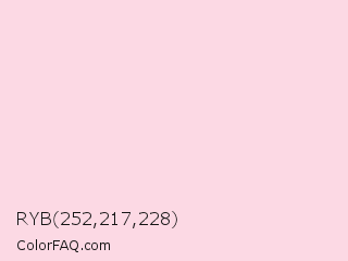 RYB 252,217,228 Color is a very light rose color and the nearest color is Pig Pink #fdd7e4. Hex code #fcd9e4 and RGB value is rgb(252,217,228). In RGB color space, this color is composed of 99% red, 85% green, 89% blue, In CMYK color space, this color is composed of 0% cyan, 14% magenta, 10% yellow , 1% black , In HSL color space, this color has a hue angle of 341° , 85% saturation and 92% lightness.