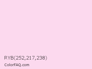 RYB 252,217,238 Color is a very light magenta color and the nearest color is Mimi Pink #ffdae9. Hex code #fcd9ee and RGB value is rgb(252,217,238). In RGB color space, this color is composed of 99% red, 85% green, 93% blue, In CMYK color space, this color is composed of 0% cyan, 14% magenta, 6% yellow , 1% black , In HSL color space, this color has a hue angle of 324° , 85% saturation and 92% lightness.