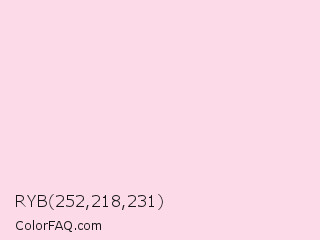 RYB 252,218,231 Color is a very light rose color and the nearest color is Piggy Pink #fddde6. Hex code #fcdae7 and RGB value is rgb(252,218,231). In RGB color space, this color is composed of 99% red, 85% green, 91% blue, In CMYK color space, this color is composed of 0% cyan, 13% magenta, 8% yellow , 1% black , In HSL color space, this color has a hue angle of 337° , 85% saturation and 92% lightness.