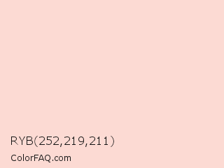 RYB 252,219,211 Color is a very light red color and the nearest color is Peach Schnapps #ffdcd6. Hex code #fcdad3 and RGB value is rgb(252,218,211). In RGB color space, this color is composed of 99% red, 85% green, 83% blue, In CMYK color space, this color is composed of 0% cyan, 13% magenta, 16% yellow , 1% black , In HSL color space, this color has a hue angle of 10° , 87% saturation and 91% lightness.