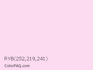 RYB 252,219,241 Color is a very light magenta color and the nearest color is Pink Lace #ffddf4. Hex code #fcdbf1 and RGB value is rgb(252,219,241). In RGB color space, this color is composed of 99% red, 86% green, 95% blue, In CMYK color space, this color is composed of 0% cyan, 13% magenta, 4% yellow , 1% black , In HSL color space, this color has a hue angle of 320° , 85% saturation and 92% lightness.
