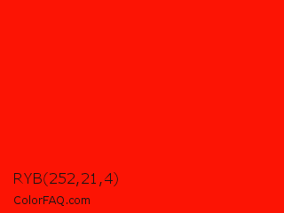 RYB 252,21,4 Color is a normal red color and the nearest color is Candy Apple Red #ff0800. Hex code #fc1404 and RGB value is rgb(252,20,4). In RGB color space, this color is composed of 99% red, 8% green, 2% blue, In CMYK color space, this color is composed of 0% cyan, 92% magenta, 98% yellow , 1% black , In HSL color space, this color has a hue angle of 4° , 98% saturation and 50% lightness.