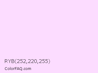 RYB 252,220,255 Color is a very light magenta color and the nearest color is Pink Lace #ffddf4. Hex code #fcdcff and RGB value is rgb(252,220,255). In RGB color space, this color is composed of 99% red, 86% green, 100% blue, In CMYK color space, this color is composed of 1% cyan, 14% magenta, 0% yellow , 0% black , In HSL color space, this color has a hue angle of 295° , 100% saturation and 93% lightness.