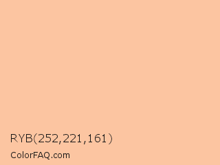 RYB 252,221,161 Color is a very light orange color and the nearest color is Flesh #ffcba4. Hex code #fcc5a1 and RGB value is rgb(252,197,161). In RGB color space, this color is composed of 99% red, 77% green, 63% blue, In CMYK color space, this color is composed of 0% cyan, 22% magenta, 36% yellow , 1% black , In HSL color space, this color has a hue angle of 24° , 94% saturation and 81% lightness.