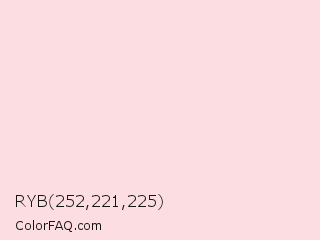 RYB 252,221,225 Color is a very light red color and the nearest color is Piggy Pink #fddde6. Hex code #fcdde1 and RGB value is rgb(252,221,225). In RGB color space, this color is composed of 99% red, 87% green, 88% blue, In CMYK color space, this color is composed of 0% cyan, 12% magenta, 11% yellow , 1% black , In HSL color space, this color has a hue angle of 352° , 84% saturation and 93% lightness.