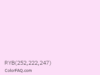 RYB 252,222,247 Color is a very light magenta color and the nearest color is Pink Lace #ffddf4. Hex code #fcdef7 and RGB value is rgb(252,222,247). In RGB color space, this color is composed of 99% red, 87% green, 97% blue, In CMYK color space, this color is composed of 0% cyan, 12% magenta, 2% yellow , 1% black , In HSL color space, this color has a hue angle of 310° , 83% saturation and 93% lightness.