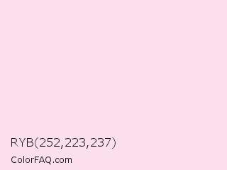 RYB 252,223,237 Color is a very light rose color and the nearest color is Carousel Pink #f9e0ed. Hex code #fcdfed and RGB value is rgb(252,223,237). In RGB color space, this color is composed of 99% red, 87% green, 93% blue, In CMYK color space, this color is composed of 0% cyan, 12% magenta, 6% yellow , 1% black , In HSL color space, this color has a hue angle of 331° , 83% saturation and 93% lightness.