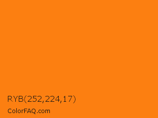 RYB 252,224,17 Color is a normal orange color and the nearest color is Ecstasy #fa7814. Hex code #fc7f11 and RGB value is rgb(252,127,17). In RGB color space, this color is composed of 99% red, 50% green, 7% blue, In CMYK color space, this color is composed of 0% cyan, 50% magenta, 93% yellow , 1% black , In HSL color space, this color has a hue angle of 28° , 98% saturation and 53% lightness.
