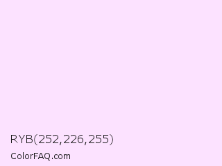 RYB 252,226,255 Color is a very light magenta color and the nearest color is Pink Lace #ffddf4. Hex code #fce2ff and RGB value is rgb(252,226,255). In RGB color space, this color is composed of 99% red, 89% green, 100% blue, In CMYK color space, this color is composed of 1% cyan, 11% magenta, 0% yellow , 0% black , In HSL color space, this color has a hue angle of 294° , 100% saturation and 94% lightness.
