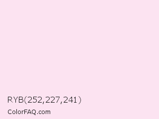 RYB 252,227,241 Color is a very light magenta color and the nearest color is Pale Rose #ffe1f2. Hex code #fce3f1 and RGB value is rgb(252,227,241). In RGB color space, this color is composed of 99% red, 89% green, 95% blue, In CMYK color space, this color is composed of 0% cyan, 10% magenta, 4% yellow , 1% black , In HSL color space, this color has a hue angle of 326° , 81% saturation and 94% lightness.