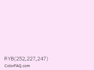 RYB 252,227,247 Color is a very light magenta color and the nearest color is Pale Rose #ffe1f2. Hex code #fce3f7 and RGB value is rgb(252,227,247). In RGB color space, this color is composed of 99% red, 89% green, 97% blue, In CMYK color space, this color is composed of 0% cyan, 10% magenta, 2% yellow , 1% black , In HSL color space, this color has a hue angle of 312° , 81% saturation and 94% lightness.
