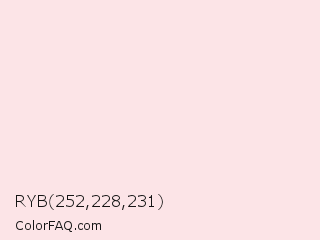 RYB 252,228,231 Color is a very light red color and the nearest color is Misty Rose #ffe4e1. Hex code #fce4e7 and RGB value is rgb(252,228,231). In RGB color space, this color is composed of 99% red, 89% green, 91% blue, In CMYK color space, this color is composed of 0% cyan, 10% magenta, 8% yellow , 1% black , In HSL color space, this color has a hue angle of 353° , 80% saturation and 94% lightness.