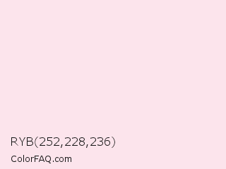 RYB 252,228,236 Color is a very light rose color and the nearest color is Carousel Pink #f9e0ed. Hex code #fce4ec and RGB value is rgb(252,228,236). In RGB color space, this color is composed of 99% red, 89% green, 93% blue, In CMYK color space, this color is composed of 0% cyan, 10% magenta, 6% yellow , 1% black , In HSL color space, this color has a hue angle of 340° , 80% saturation and 94% lightness.