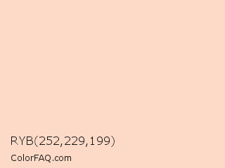 RYB 252,229,199 Color is a very light orange color and the nearest color is Unbleached Silk #ffddca. Hex code #fcdac7 and RGB value is rgb(252,218,199). In RGB color space, this color is composed of 99% red, 85% green, 78% blue, In CMYK color space, this color is composed of 0% cyan, 13% magenta, 21% yellow , 1% black , In HSL color space, this color has a hue angle of 22° , 90% saturation and 88% lightness.