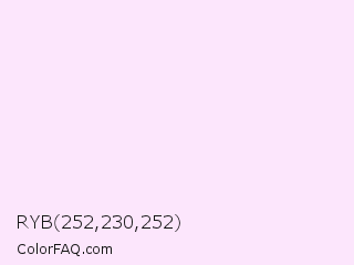 RYB 252,230,252 Color is a almost white magenta color and the nearest color is Amour #f9eaf3. Hex code #fce6fc and RGB value is rgb(252,230,252). In RGB color space, this color is composed of 99% red, 90% green, 99% blue, In CMYK color space, this color is composed of 0% cyan, 9% magenta, 0% yellow , 1% black , In HSL color space, this color has a hue angle of 300° , 79% saturation and 95% lightness.