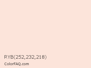 RYB 252,232,218 Color is a very light orange color and the nearest color is Cinderella #fde1dc. Hex code #fce4da and RGB value is rgb(252,228,218). In RGB color space, this color is composed of 99% red, 89% green, 85% blue, In CMYK color space, this color is composed of 0% cyan, 10% magenta, 13% yellow , 1% black , In HSL color space, this color has a hue angle of 18° , 85% saturation and 92% lightness.