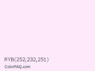 RYB 252,232,251 Color is a almost white magenta color and the nearest color is Remy #feebf3. Hex code #fce8fb and RGB value is rgb(252,232,251). In RGB color space, this color is composed of 99% red, 91% green, 98% blue, In CMYK color space, this color is composed of 0% cyan, 8% magenta, 0% yellow , 1% black , In HSL color space, this color has a hue angle of 303° , 77% saturation and 95% lightness.