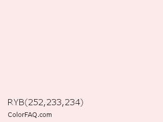 RYB 252,233,234 Color is a almost white red color and the nearest color is Fair Pink #ffefec. Hex code #fce9ea and RGB value is rgb(252,233,234). In RGB color space, this color is composed of 99% red, 91% green, 92% blue, In CMYK color space, this color is composed of 0% cyan, 8% magenta, 7% yellow , 1% black , In HSL color space, this color has a hue angle of 357° , 76% saturation and 95% lightness.