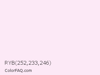 RYB 252,233,246 Color is a almost white magenta color and the nearest color is Remy #feebf3. Hex code #fce9f6 and RGB value is rgb(252,233,246). In RGB color space, this color is composed of 99% red, 91% green, 96% blue, In CMYK color space, this color is composed of 0% cyan, 8% magenta, 2% yellow , 1% black , In HSL color space, this color has a hue angle of 319° , 76% saturation and 95% lightness.