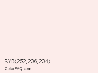 RYB 252,236,234 Color is a almost white red color and the nearest color is Fair Pink #ffefec. Hex code #fcecea and RGB value is rgb(252,236,234). In RGB color space, this color is composed of 99% red, 93% green, 92% blue, In CMYK color space, this color is composed of 0% cyan, 6% magenta, 7% yellow , 1% black , In HSL color space, this color has a hue angle of 7° , 75% saturation and 95% lightness.