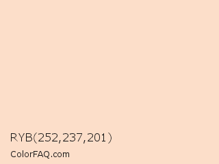 RYB 252,237,201 Color is a very light orange color and the nearest color is Unbleached Silk #ffddca. Hex code #fcdec9 and RGB value is rgb(252,222,201). In RGB color space, this color is composed of 99% red, 87% green, 79% blue, In CMYK color space, this color is composed of 0% cyan, 12% magenta, 20% yellow , 1% black , In HSL color space, this color has a hue angle of 25° , 89% saturation and 89% lightness.