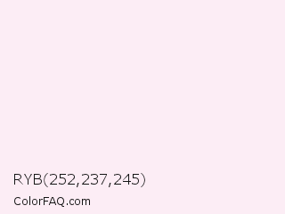 RYB 252,237,245 Color is a almost white rose color and the nearest color is Remy #feebf3. Hex code #fcedf5 and RGB value is rgb(252,237,245). In RGB color space, this color is composed of 99% red, 93% green, 96% blue, In CMYK color space, this color is composed of 0% cyan, 6% magenta, 3% yellow , 1% black , In HSL color space, this color has a hue angle of 328° , 71% saturation and 96% lightness.