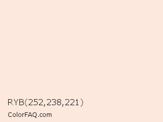 RYB 252,238,221 Color is a very light orange color and the nearest color is Misty Rose #ffe4e1. Hex code #fce8dd and RGB value is rgb(252,232,221). In RGB color space, this color is composed of 99% red, 91% green, 87% blue, In CMYK color space, this color is composed of 0% cyan, 8% magenta, 12% yellow , 1% black , In HSL color space, this color has a hue angle of 21° , 84% saturation and 93% lightness.