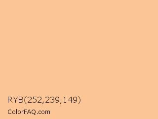 RYB 252,239,149 Color is a light orange color and the nearest color is Peach Orange #ffcc99. Hex code #fcc595 and RGB value is rgb(252,197,149). In RGB color space, this color is composed of 99% red, 77% green, 58% blue, In CMYK color space, this color is composed of 0% cyan, 22% magenta, 41% yellow , 1% black , In HSL color space, this color has a hue angle of 28° , 94% saturation and 79% lightness.