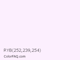 RYB 252,239,254 Color is a almost white magenta color and the nearest color is Tutu #fff1f9. Hex code #fceffe and RGB value is rgb(252,239,254). In RGB color space, this color is composed of 99% red, 94% green, 100% blue, In CMYK color space, this color is composed of 1% cyan, 6% magenta, 0% yellow , 0% black , In HSL color space, this color has a hue angle of 292° , 88% saturation and 97% lightness.