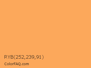 RYB 252,239,91 Color is a light orange color and the nearest color is Rajah #fbab60. Hex code #fca85b and RGB value is rgb(252,168,91). In RGB color space, this color is composed of 99% red, 66% green, 36% blue, In CMYK color space, this color is composed of 0% cyan, 33% magenta, 64% yellow , 1% black , In HSL color space, this color has a hue angle of 29° , 96% saturation and 67% lightness.