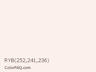 RYB 252,241,236 Color is a almost white color and the nearest color is Bridesmaid #fef0ec. Hex code #fcf0ec and RGB value is rgb(252,240,236). In RGB color space, this color is composed of 99% red, 94% green, 93% blue, In CMYK color space, this color is composed of 0% cyan, 5% magenta, 6% yellow , 1% black , In HSL color space, this color has a hue angle of 15° , 73% saturation and 96% lightness.